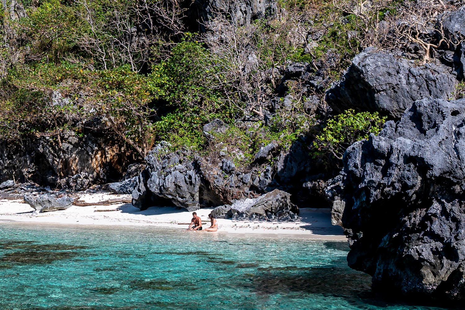 We set course towards the Bacuit Bay to the sound of guitar, local Philippine songs sung by the crew. It didn’t take long for our first stop, the beautiful Matinloc Island, reminiscent of Maya Bay in Thailand. With its pearl white beaches, lush palm trees, and limestone rock formations, it could have been Koh Phi Phi, Koh Lanta, or any other Krabi island lost to the mass tourism of the 21st century. But it wasn’t. It was the perfect alternative.